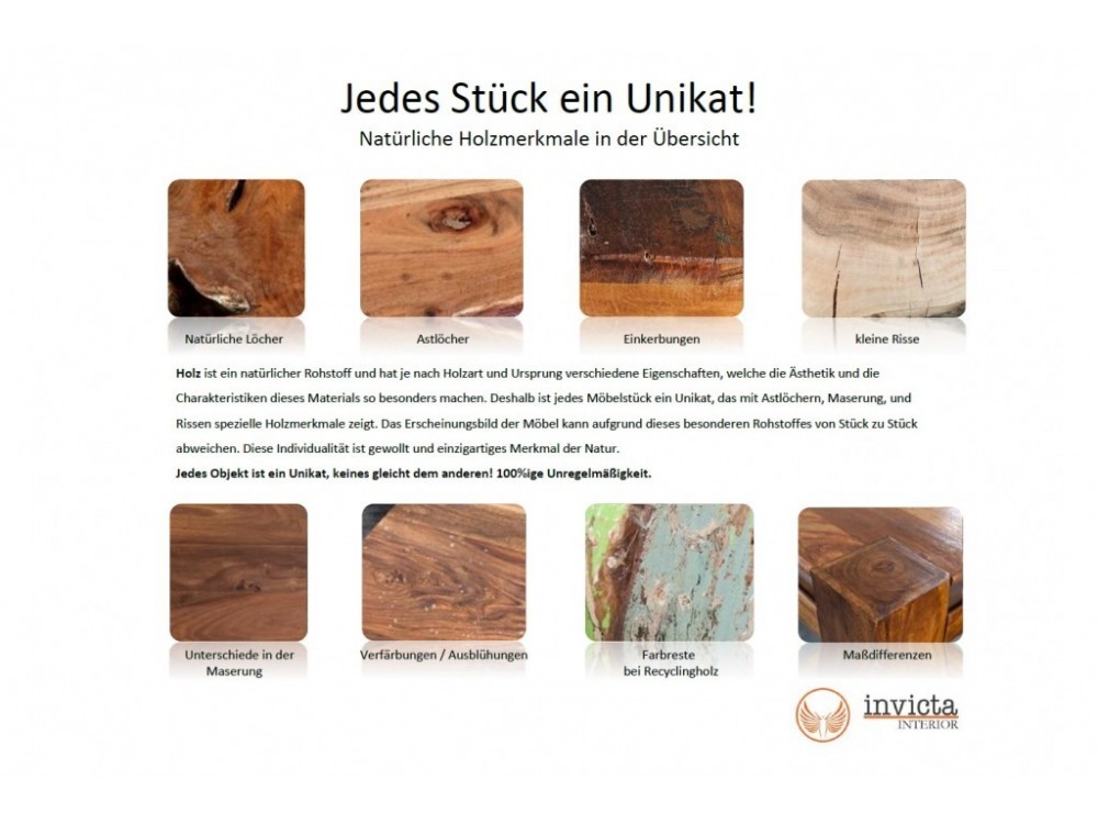 Remarque : comme il s'agit d'un produit naturel, chaque exemplaire est absolument unique. Des irrégularités, des dégradés de couleur, des trous de noeuds charismatiques, des fissures ou encore des différences de dimensions sont possibles et créent l'originalité et font le charme du bois massif. Il ne s'agit pas de motifs de réclamation.